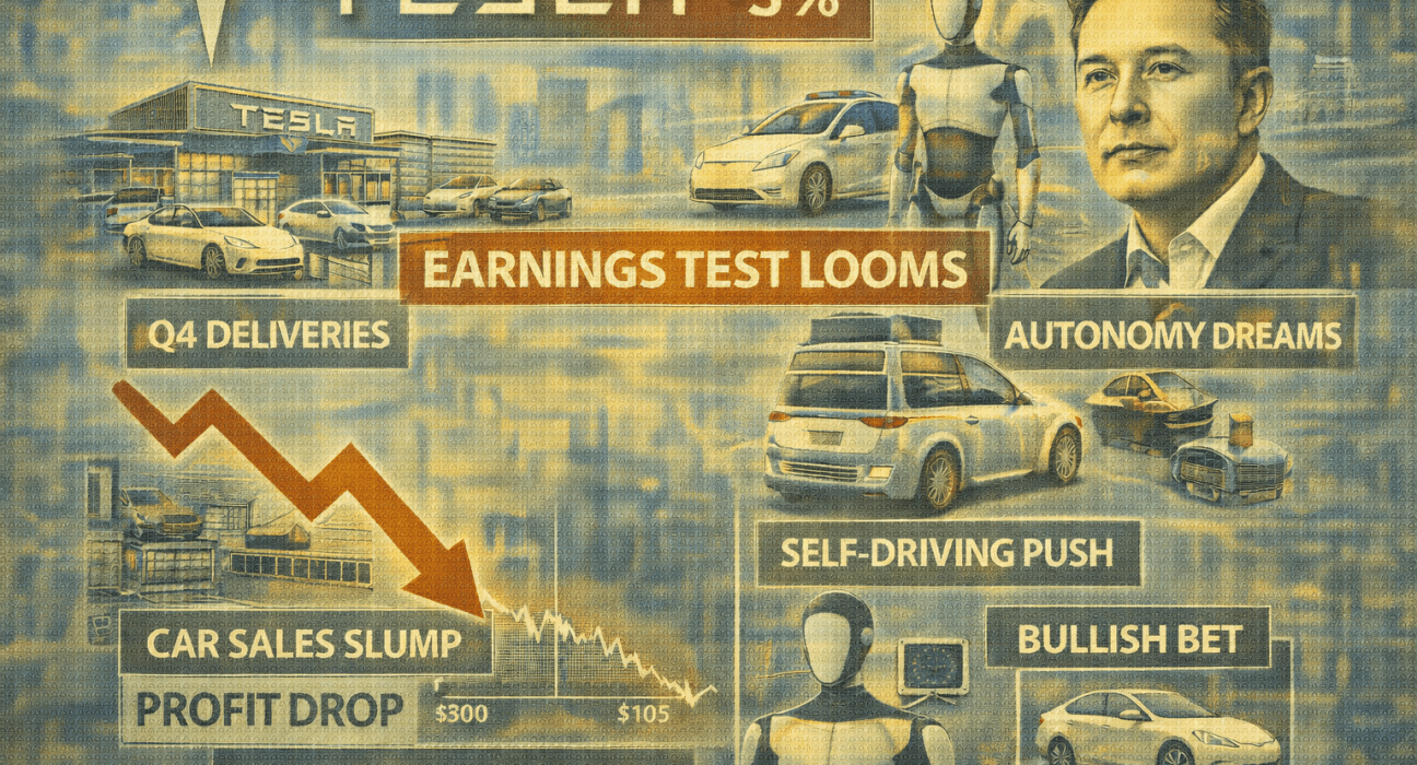 Tesla stock (NASDAQ: TSLA) eased lower on Monday as investors braced for a make‑or‑break earnings week that will test whether Elon Musk’s big autonomy promises really deliver. The stock traded down roughly 3%, well below its mid‑December peak near $490, even as the S&P 500 and Nasdaq inched higher ahead of a key Federal Reserve